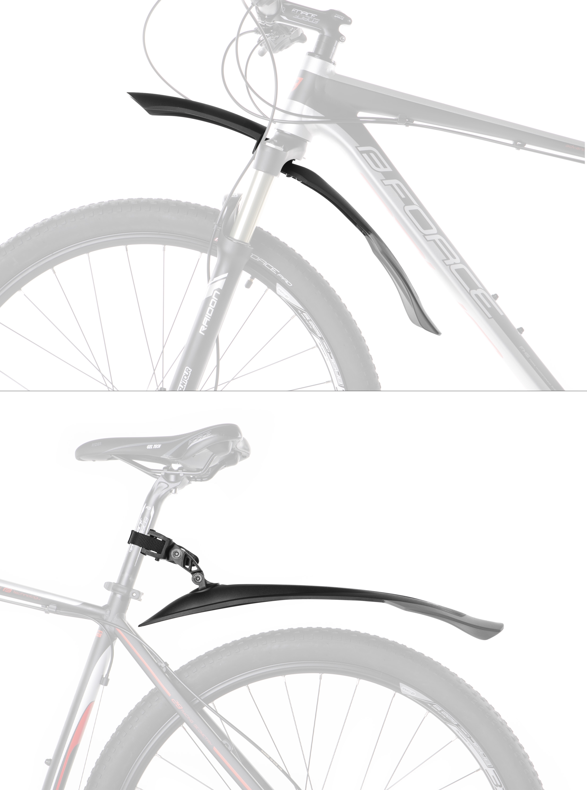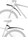 sada blatníků přední + zadní vhodné pro všechna kola 24" - 29" na odpružené vidlice (vnitřním průměrem 15-35 mm) na všechny druhy sedlovek s kulatým profilem šířka střední části blatníků: 77 mm šířka koncové (šedé) části blatníků: 100 mm materiál: plast, černo-šedé hmotnost: 91 g / 86 g (přední/zadní) baleno v sáčku